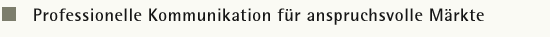 | Wünschen Sie verdienten Markterfolg mit hochwertigen Investitionsgütern oder komplexen Softwarelösungen? Bieten Sie einer wählerischen Kundschaft beratungsintensive Dienstleistungen? Planen Sie, mit technischen Innovationen neue Zielmärkte zu erschließen? Suchen Sie zielführende Kommunikations-strategien, mediale Türöffner und Unterstützung für kundenorientierte Vertriebsarbeit? Dann finden Sie hier den Partner, der kommunikative Brücken schafft zwischen technologischer Intelligenz und praktischem Nutzen, zwischen abstrakter Dienstleistung und den Menschen, die von ihr profitieren. Mit leidenschaftlicher Freude arbeite ich auch für Institutionen aus den Bereichen Bildung und Kultur.